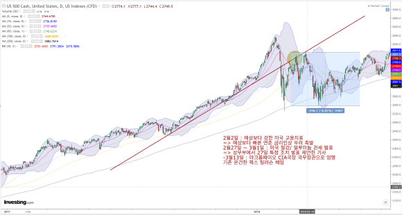 [2] 긴축 우려 (2018)2018년 2월 2일: 미국 고용지표가 예상보다 강하게 발표되면서, 연준의 빠른 금리 인상에 대한 우려가 촉발되어 추세선을 하향 돌파.2018년 2월 27일~3월 1일: 미국이 철강/알루미늄 관세를 발표. 무역 전쟁과 인플레이션 우려로 인해 추세선 상단으로의 복귀에 실패하고 저항을 맞으며 하락 전환.2018년 3월 13일: 매파인 CIA국장 폼페이오 국무장관으로 임명