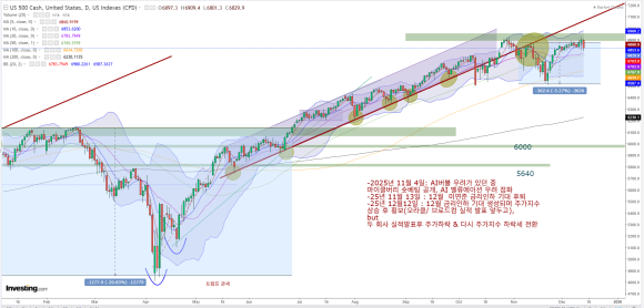 => 관전포인트 : 12월12일 브로드컴/ 오라클 실적발표 후 주가하락해 기술주들이 동반하락하며, 음봉으로 하락 마감하였습니다. 12월3주(차주)에 하락추세로 주가지수 움직임이 진행되는지 중요합니다. 기존에 형성된 저항을 강하게 상향 돌파여부를 지켜봐야합니다.