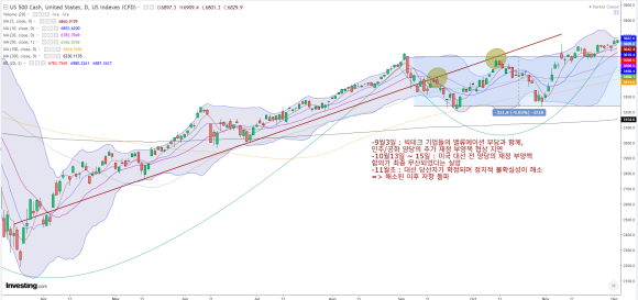 [3] 기술주 벨류 및 정치 불확실성 (2020)2020년 9월 3일: 빅테크 기업들의 밸류에이션 부담과 함께, 민주/공화 양당의 추가 재정 부양책 협상 지연이 맞물리며 하락 돌파.2020년 10월 13일~15일: 미국 대선 전 양당의 재정 부양책 합의가 최종 무산되었다는 실망감에 추세선 하단 저항을 재확인하며 하락.2020년 11월 초: 대선 당선자가 확정되며 정치적 불확실성이 해소되어 조정이 단기로 마무리됨.