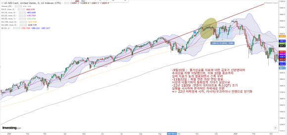 [4] 연준 긴축 및 물가 공포 (2021-2022)2021년 9월 10일: 발표 예정인 물가상승률 지표에 대한 공포가 선반영되며 추세선을 하향 이탈했으며, 이후 10월 중순까지 실제 지표가 높게 발표되면서 긴축 우려가 지속적으로 시장을 압박함.2021년 11월 22일: 파월 연준 의장 연임 발표. 시장의 비둘기파적 통화정책 기대가 실망으로 바뀌며 추세선이 강력한 저항선으로 작용.2022년 1월 5일: 연준이 대차대조표 축소(QT) 조기 실행을 시사하며 본격적인 하락세로 전환. 이후 러시아의 우크라이나 침공 가능성이 더해지며 하락세가 심화.