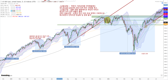 [5] 금리 인하 기대 약화 (2024-2025)2024년 12월 18일: 연준이 기준금리를 인하했음에도 점도표(dot plot)에서 2025년 인하 횟수 전망을 축소(‘hawkish cut’)하고, 트럼프 관세 정책 우려가 겹치며 추세선 하단 돌파.2024년 12월 27일: S&P 500 밸류에이션 부담과 빅테크 중심의 차익 실현 매물이 출회되며 추세선 상향 돌파에 실패하고 저항을 확인.2025년 2월 21일: 트럼프 당선 이후 관세 정책이 구체적으로 예고되면서 무역 갈등 우려가 현실화되며 본격적인 하락세로 전환.