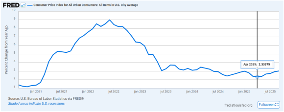 중요한 것은 물가데이터인데 우선 현재 아래 차트에서 보는 것처럼 25년 현재까지 발표된 물가상승율은 트럼프의 Liberation Day 이후에 상승 전환한 상황입니다. 이 상승세를 꺽는 수준의 데이터가 나온다면 어쩌면 이런 차트 패턴이 깨질 가능성도 배제할 수 없습니다. 하지만 물가데이터가 시장기대대비 높거나 상승추세를 유지한다면 하락으로 전환시킬 수 있는 이벤트가 될 수 있습니다.