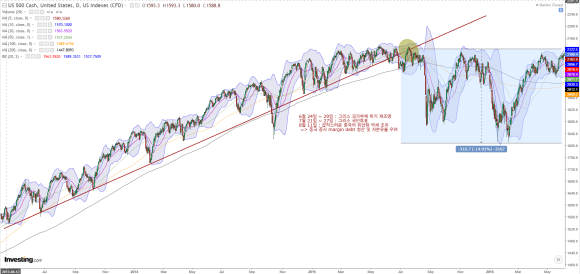 [1] 부채 위기 (2015)2014년 QE 종료 이후 글로벌 경기 둔화 우려가 지속되던 상황에서, 2015년 6월 24일~29일 그리스 국가 부채 위기가 촉발 요인으로 작용하며 추세선을 하향 돌파. (당시 시장의 핵심 우려는 ‘그리스 부채 + 중국 주식 신용거래 규제’였음)2015년 7월 21일~27일: 그리스 국민투표 관련 불확실성 속에서 반등 시도했으나, 이전의 추세선 하단이 저항으로 작용하며 재차 하락.2015년 8월 11일: 중국의 갑작스러운 위안화 약세 조치. 이로 인한 중국 증시 하락 및 자본 유출 우려가 글로벌 시장으로 확산되며 S&P 500의 본격적인 하락을 촉발.