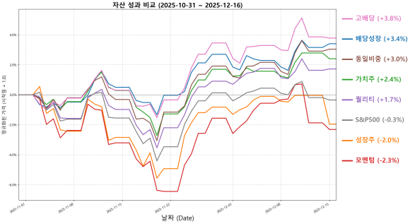 현재 시장은 섹터 로테이션이 진행 중입니다. 2025년 트럼프 2기 정부 출범 이후 지속되던 ‘기술주 쏠림’ 현상이 완화되고, 10월 중순 이후부터는 그동안 부진했던 경기민감주와 가치주의 성과가 지수 대비 개선되는 흐름을 보이고 있습니다. 반면 기술주는 상대적으로 부진한 모습을 보이고 있습니다.