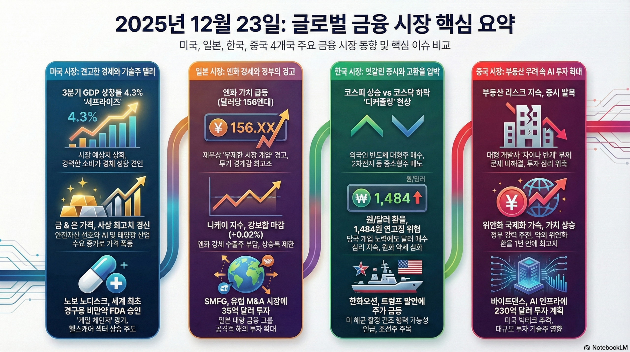 미국의 4.3% GDP 서프라이즈와 일본의 고강도 환율 개입 경고가 교차하며 글로벌 자산 시장의 변동성이 확대된 12월 23일 시황을 심층 분석합니다. 사상 최고치를 경신한 원자재 시장부터 바이오·조선 등 급등 섹터의 핵심 트리거를 정리하였습니다.